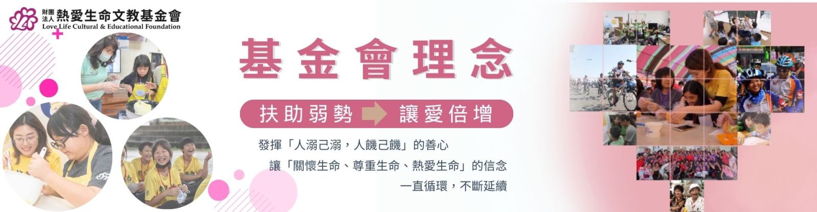財團法人熱愛生命文教基金會提供弱勢家庭的孩童及青少年除了課業學習外的第二專長培訓,並透過「品格教育」、「職能訓練」、「技能訓練」、「動能訓練」及「國際視野」等五大學習主軸,幫助更多身處弱勢家庭環境卻仍有夢想的孩子,培養有一技之長與興趣,建立一個能實際幫助弱勢族群孩子們「踏實築夢,實現希望,展翅高飛」的平台,更增加他們社會參與服務機會,使這些弱勢家庭的孩童及青少年成為助人者,培養「取之社會,用之社會」的理念,並以自身之力實踐回饋。
